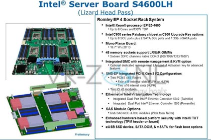 По данным источника, специалисты компании Intel разрабатывают системную плату с четырьмя процессорными гнездами LGA2011, в которую можно будет установить до 1 ТБ оперативной памяти. Изделие под обозначением S4600LH (условное название Lizard Head Pass) предназначено для серверов. Каждое из процессорных гнезд S4600LH связано с 12 слотами для модулей памяти DDR3, объединенными в четыре канала по три слота. Общее число слотов равно 48. Несложно подсчитать - установив в каждый слот по модулю объемом 32 ГБ, можно получить суммарный объем 1,5 ТБ памяти. Модули DDR3 объемом 32 ГБ в августе показала компания Samsung. Плата будет поддерживать восьмиядерные процессоры Xeon E5-4600 (Sandy Bridge-EP). Ее основой стал набор системной логики Intel C600 (Patsburg). Привычных слотов расширения на плате нет - вместо этого есть два разъема, на каждый из которых выведено по 48 линий PCI-Express 3.0. Эти разъемы предназначены для подключения плат расширения, на которых, в свою очередь, находится по три слота PCI-Express 3.0 x16. На плате есть два двухпортовых контроллера Ethernet с поддержкой виртуализации. Размеры платы - 42,4 х 50,8 см. Как утверждается, модель Intel S4600LH появится ...read more...