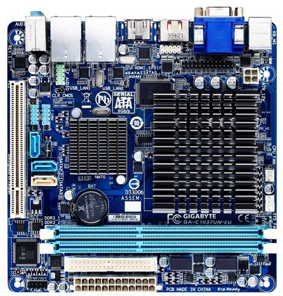 В ассортименте компании Gigabyte появилась новая материнская плата - GA-C1037UN-EU. Новинка интересна не только своими компактными размерами, которые позволяют ей вписаться в рамки форм-фактора Micro-ITX, но еще и использованием встроенного процессора Intel для мобильных компьютеров (в том числе и ультрабуков) Celeron 1037U. Небольшое тепловыделение последнего позволяет использовать в GA-C1037UN-EU систему пассивного охлаждения. Celeron 1037U, напомним, был выпущен в начале текущего года. Он оснащен двумя вычислительными ядрами частотой 1,8 ГГц, 2 МБ кэш-памяти третьего уровня, интегрированным графическим ядром с максимальной частотой 1 ГГц. Что касается самой системной платы, то она построена на чипсете Intel NM70 и располагает двумя полноразмерными слотами для модулей оперативной памяти DDR3, одним слотом PCI и тремя разъемами SATA (из них один SATA 6 Гбит/с, два SATA 3 Гбит/с). На самой плате также имеется разводка для вывода портов COM и LPT. Один порт COM по умолчанию уже присутствует на панели интерфейсных разъемов. Компанию ему составляют два порта PS/2, видеовыходы D-Sub и HDMI, четыре порта USB 2.0 и один eSATA, два разъема RJ-45, ...read more...