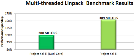 Еще одной дисциплиной, в которой NVIDIA Kal-El блеснул своими четырехъядерными способностями, стал Linpack. Не меньший прирост должен наблюдаться и в реальных приложениях, оптимизированных для многопоточного исполнения.