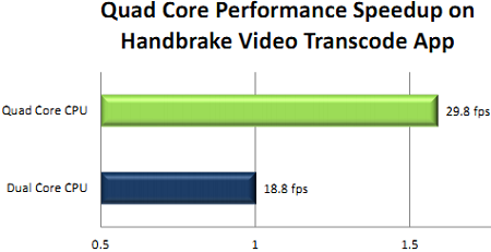В конвертере видео Handbrake, как и в предыдущем тесте, у Kal-El отключили два ядра и сравнили результаты с «полной» версией этой однокристальной системы.