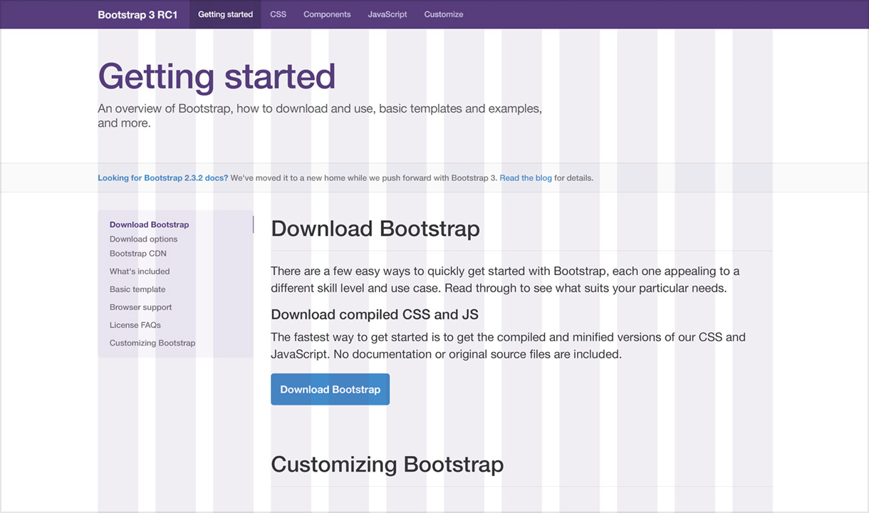 Вы можете выбрать из http://getbootstrap.com/ скачать последнюю версию Bootstrap на. При нажатии на эту ссылку, вы увидите страницу, показанную ниже:
