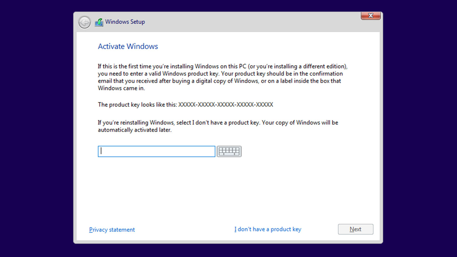 Если у вас имеется ключ продукта для Windows, введите его и щелкните по кнопке Next (Далее). В противном случае выберите [I don’t have a product key] (У меня нет ключа продукта).