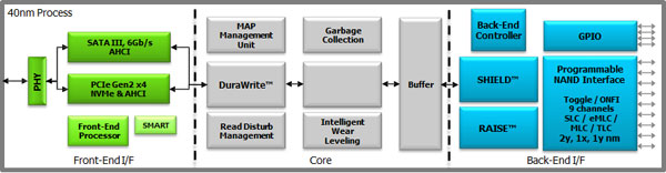 Контроллеры линейки SandForce SF3700 поддерживают технологию коррекции ошибок Shield, технологию DuraWrite, обеспечивающую оптимизацию количества циклов записи, технологию защиты данных RAISE и шифрование по алгоритму AES с длиной ключа 256 бит.